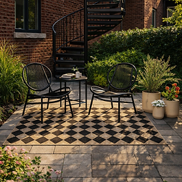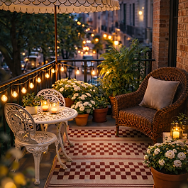 Avec ses fauteuils confortables, son tapis graphique et ses plantes, ce balcon devient un véritable salon extérieur au cœur de la ville.